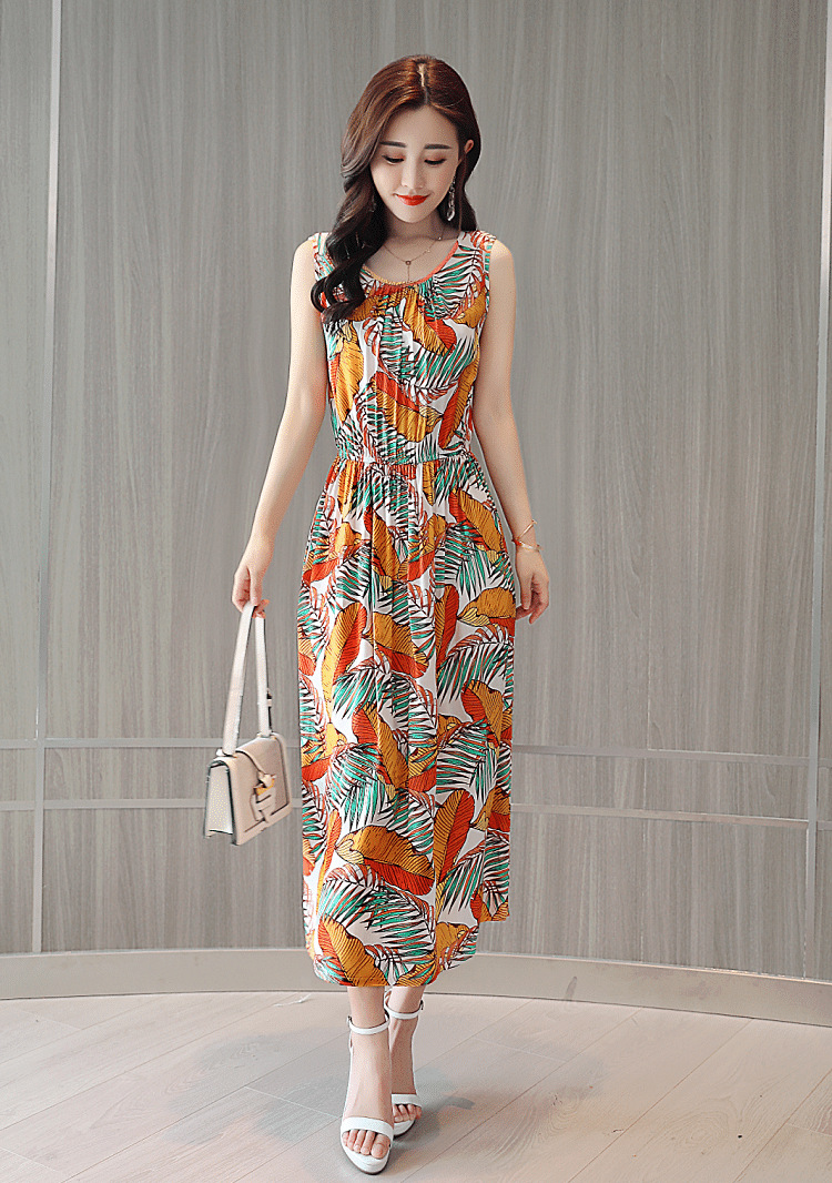 連衣裙女夏2018新款印花夏裝中長款小個子修身收腰背心純棉裙子