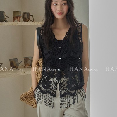 廣州十三行25夏季新款重工鏤空蕾絲鉤花無袖背心流蘇女上衣17632