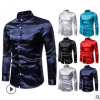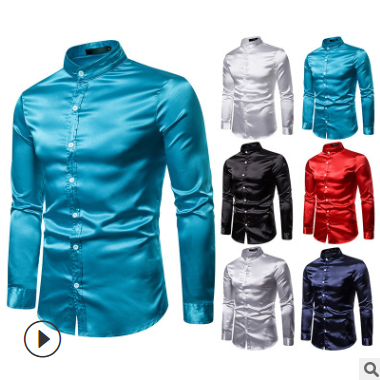歐碼男士高品質休閑時尚亮面長袖亨利領襯衫秋冬新品純色襯衣