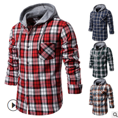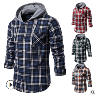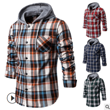 秋冬新款 男裝休閑日常大格子裝飾連帽襯衫男式長(zhǎng)袖襯衫