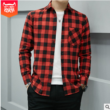 19春秋季男士襯衫磨毛格子襯衣時尚休閑青年棉質男式絨布寸衫男裝