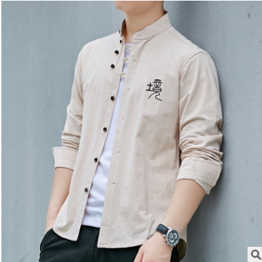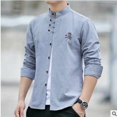 春季新款中國風男士純棉長袖襯衫立領盤扣中式復古唐裝休閑白襯衣