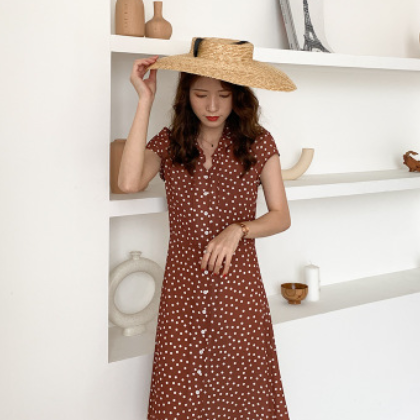 V領收腰顯瘦波點連衣裙花邊領中長款女裙夏季2020新款俏皮A字裙子