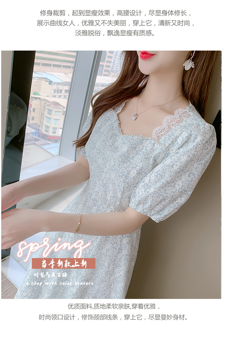 2021夏新法式方領收腰顯瘦氣質碎花連衣裙女神范長裙