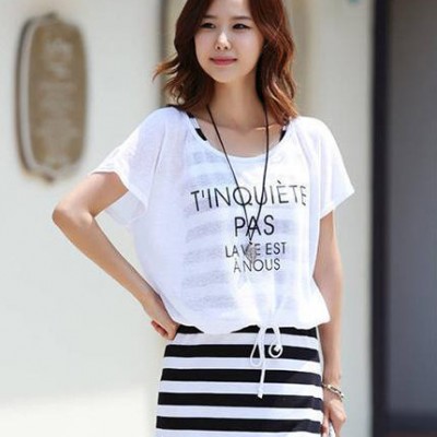 2015夏裝新款韓版女裝大碼休閑學生條紋背心裙兩件套連衣裙