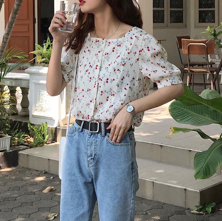 2021夏季新款元氣少女小清新甜美溫柔風方領泡泡袖小碎花衫