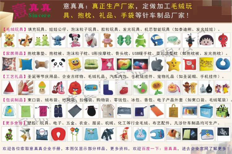深圳市意真真實業有限公司,始于1998。專業毛絨玩具、抱枕、圣誕禮品、束口袋設計定做生產廠家。堅持誠信**,做**廠家!歡迎咨詢。聯系電話:15002054456 QQ:948386158 郵箱:51guo51@sina.com微博:@意真真