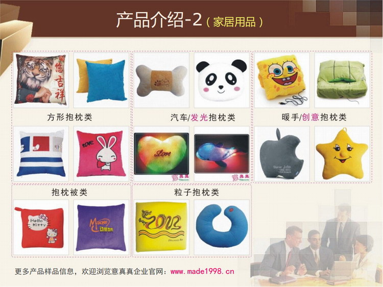 抱枕靠墊、抱枕被、泡沫粒子枕、U形按摩枕、骨頭枕、USB暖手枕、嬰兒定型枕(如抱枕被、發光抱枕)。