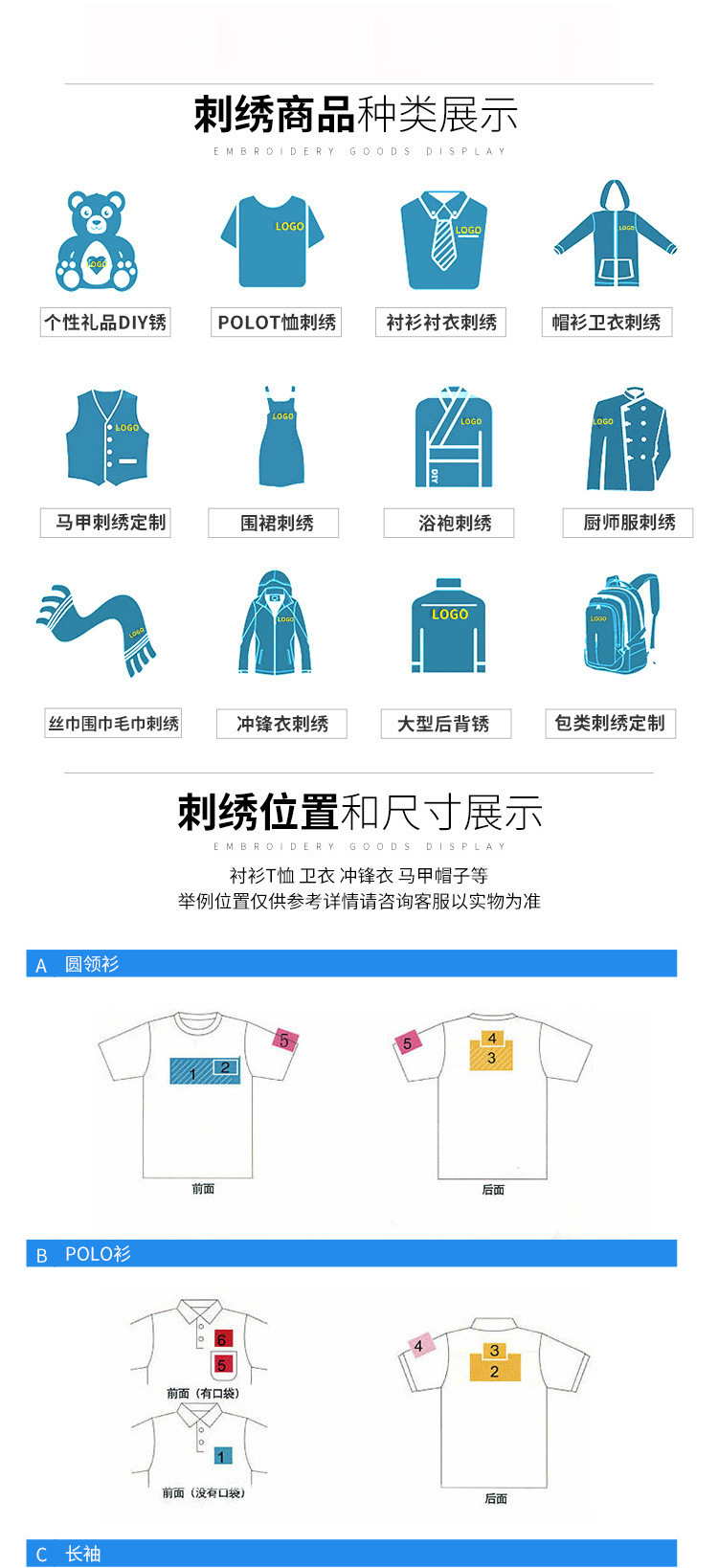 —工藝技術(shù):滿繡、平繡、3D立體繡、毛巾繡、珠片繡、翻轉(zhuǎn)繡、印度繡、紗線鎖邊、繡花線包邊、激光 切邊、熱切拉邊、手工剪邊、背膠、背雙面膠、背魔術(shù)貼、背網(wǎng)布、背別針等; |