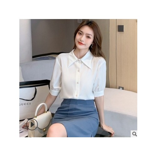 白襯衫設計感小眾職場輕熟風女裝面試穿搭尖領短袖雪紡上衣服