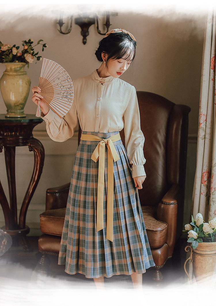 文藝古風套裝2021春季新款國風復古漢服長袖襯衫格子半身裙兩件套