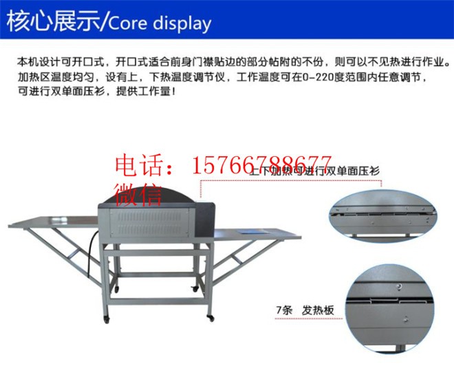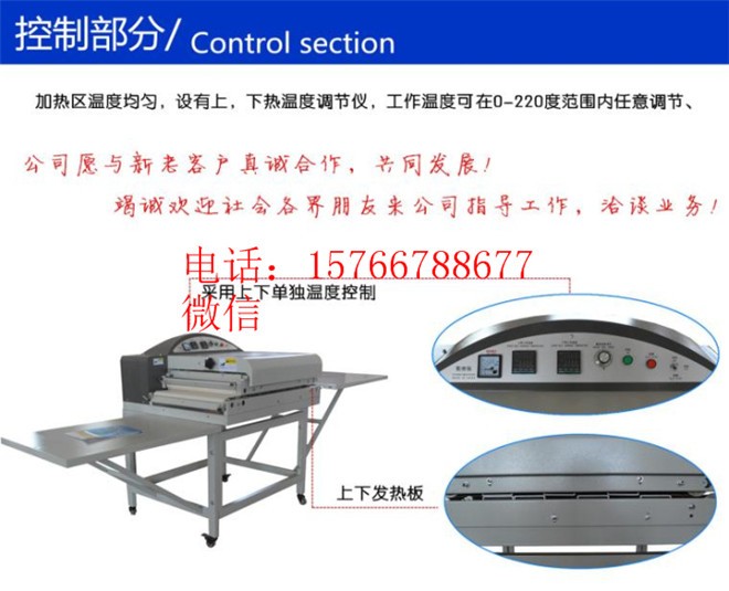 4加熱區溫度均勻,設有上,下熱溫度調節儀,工作溫度可在0-220度范圍內任意調節,可進行雙單面壓衫,