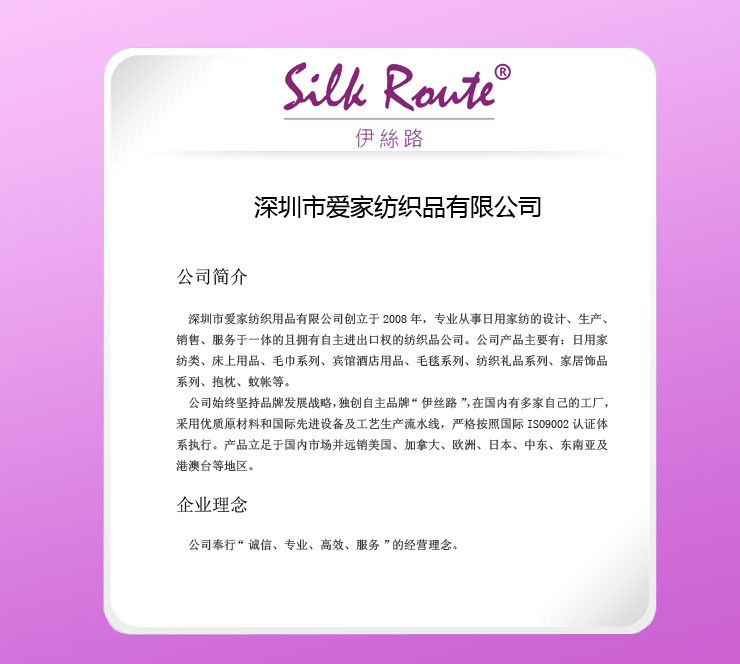 深圳愛家紡織品有限公司在紡織禮品行業中具有多年的經驗,專門給各個企事業單位定制廣告毛巾、禮品毛巾、促銷毛巾,可為客戶設計制作產品包裝,刺繡logo,同時給外地禮品公司提供代采業務,只要您提供產品的貨號、花型、或者廠家其他的我們來為您做。
