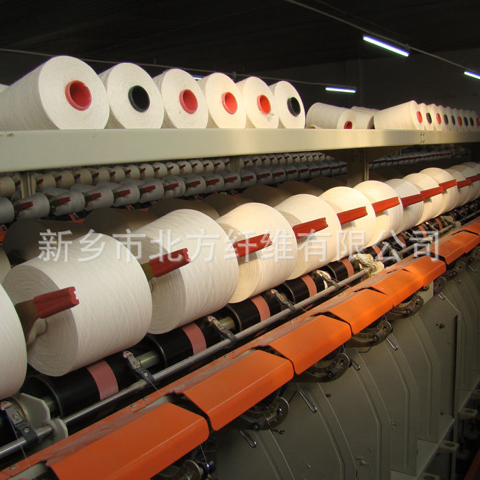 紗線經(jīng)高速并紗機(jī)合股、短纖倍捻機(jī)加捻。