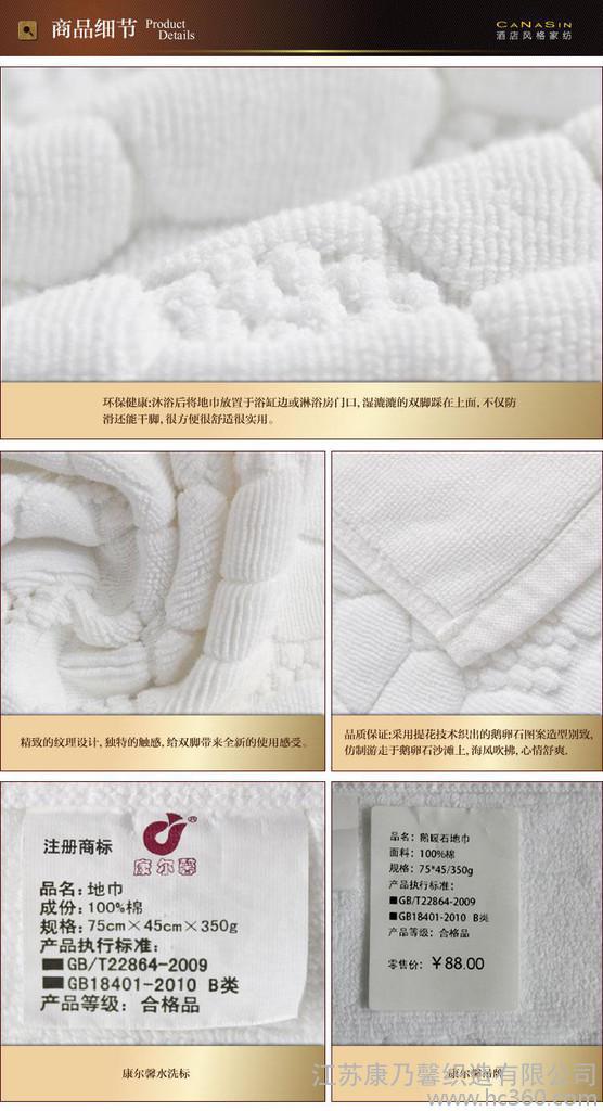 本公司供應康乃馨五星級酒32s/2提花地巾,品牌康爾馨,型號鵝卵石。參數為:花色* 素色,形狀* 長方形,產地 江蘇淮安,材質 全棉,顏色 白色,成品邊子 包邊。質量保證,歡迎咨詢洽談。