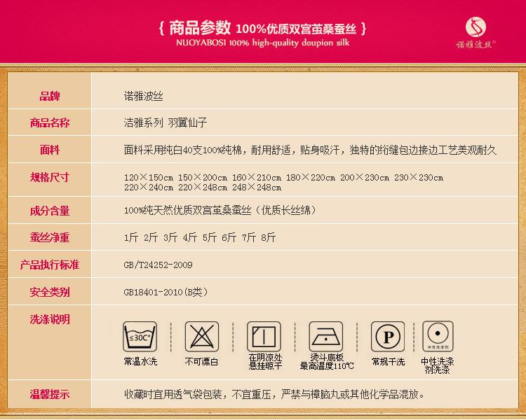 諾雅波絲被,精選****桑蠶上繭為原料,采用曾榮獲日本國科技部重大發明獎、貞明皇后紀念蠶絲獎的日本馬佩佩株式會社**技術,通過精密繅絲工藝形成單根波狀長絲絨,每根絲絨直徑約2.65但尼爾,單絲長800—1200米。在精密繅絲生產過程中設有單絲均布裝置、單絲回彈波狀安定處理裝置,當若干單絲上束之后,經過以上工藝形成波絲束自然均布有序的按照設定的門幅寬度片狀徑向進入特殊絎縫流程,然后將波絲有序緯向絎縫定位成設定規格的波絲絨片狀體,即“諾雅波絲”。諾雅波絲顏色雪白、質地均勻、輕柔(絲束緒頭可直扎眼球無痛感)、回彈性能好,不含油、無氣味,加工時不添加任何化學物質,無污染**環保,是一種品質極好、舒適宜人**的保暖材料。波狀的被胎結構有助于被褥中棉本體充分地吸收和保持空氣,形成保暖層,并借助絲胎結構良好的彈性、良好的水氣透析性、良好的排濕性以及波狀絹絲特殊的柔滑性,使諾雅波絲被輕柔至暖、冬暖夏涼的健康特性。諾雅波絲是經過安定處理工藝形成的**波狀長絲,具有**波狀安定性。
