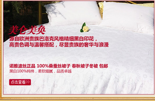 諾雅波絲水洗蠶絲被誠招全國代理,經銷商歡迎各位來我廠考查! 常德諾雅蠶絲制品有限公司蠶絲被均取材**桑蠶絲長絲綿,采用“內絎縫,內包邊,內街邊”**技術精心制作。公司擁有兩項全球**的制被科技發明** “水洗保潔、絲膠保健”技術,使絲膠含量更高,保健功能更強**的蠶絲被制作廠家,貼心的蠶絲被售后服務,諾雅蠶絲被產品承諾:本產品優于傳統工藝,可水洗去污,50年免翻新。中國蠶絲被**聯盟認證品牌 諾雅波絲全球**真正可水洗**蠶絲制被** **商務部確認為“水洗保浩,絲膠保健”蠶絲被建設試點企業 |