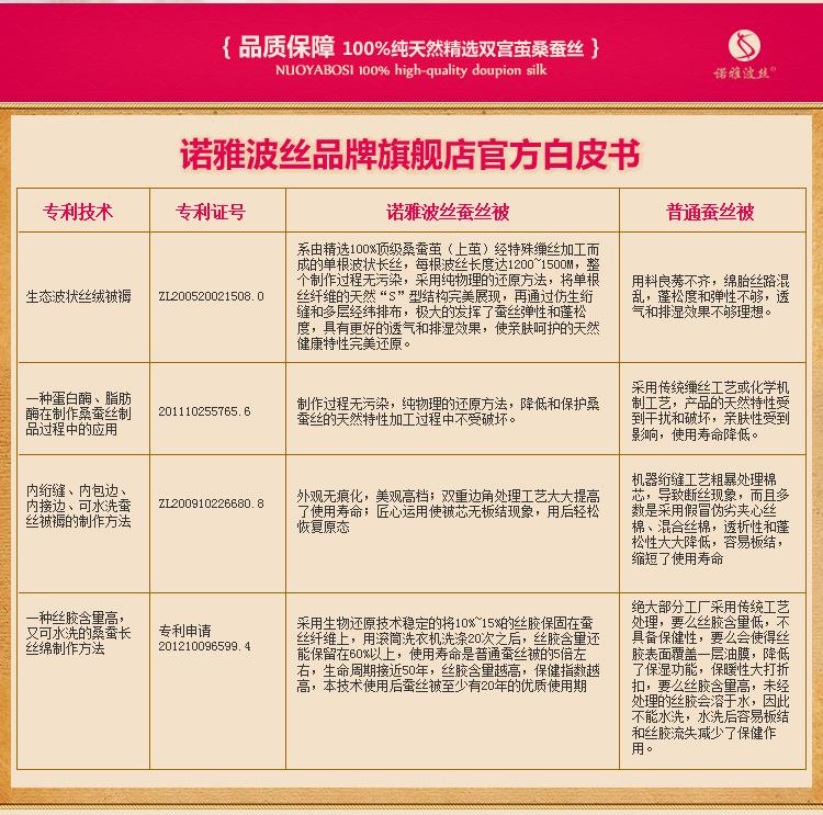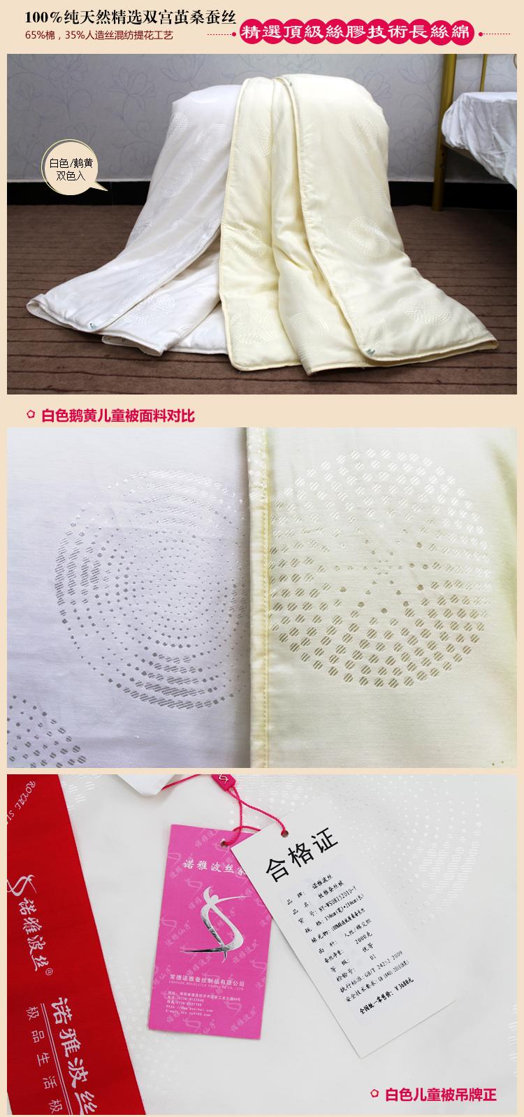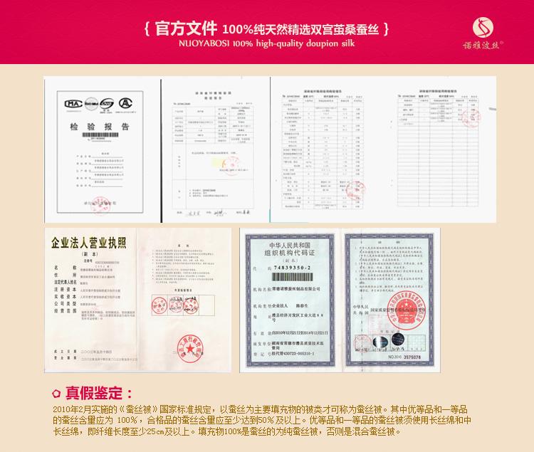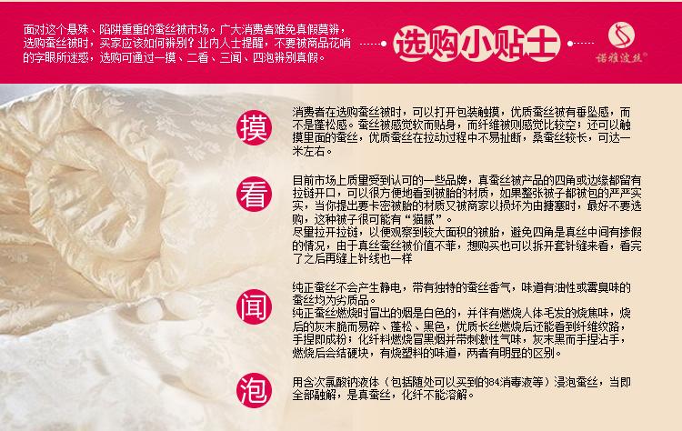 常德諾雅蠶絲制品有限公司蠶絲被均取材**桑蠶絲長絲綿,采用“內絎縫,內包邊,內街邊”**技術精心制作。公司擁有兩項全球**的制被科技發明** “水洗保潔、絲膠保健”技術,使絲膠含量更高,保健功能更強**的蠶絲被制作廠家,貼心的蠶絲被售后服務,諾雅蠶絲被產品承諾:本產品優于傳統工藝,可水洗去污,50年免翻新。中國蠶絲被**聯盟認證品牌。 |