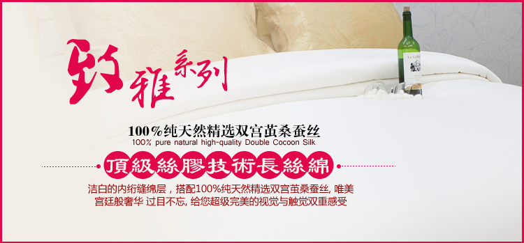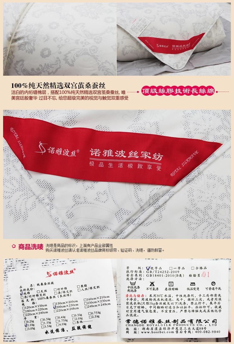 常德諾雅蠶絲制品有限公司蠶絲被均取材**桑蠶絲長絲綿,采用“內(nèi)絎縫,內(nèi)包邊,內(nèi)街邊”**技術精心制作。公司擁有兩項全球**的制被科技發(fā)明** “水洗保潔、絲膠保健”技術,使絲膠含量更高,保健功能更強**的蠶絲被制作廠家,貼心的蠶絲被售后服務,諾雅蠶絲被產(chǎn)品承諾:本產(chǎn)品優(yōu)于傳統(tǒng)工藝,可水洗去污,50年免翻新。中國蠶絲被**聯(lián)盟認證品牌 諾雅波絲全球**真正可水洗**蠶絲制被** **商務部確認為“水洗保浩,絲膠保健”蠶絲被建設試點企業(yè)