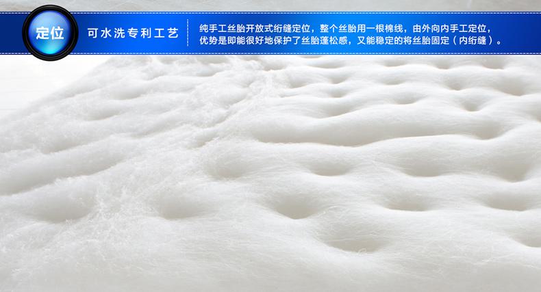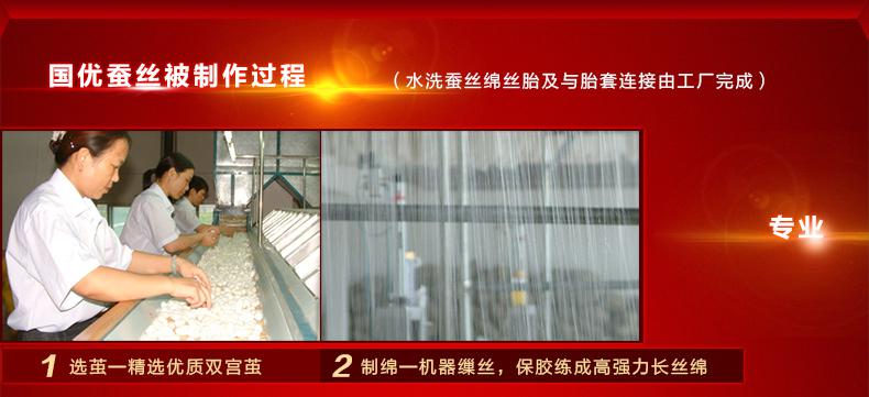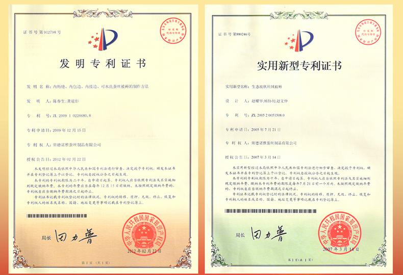 所有產品均采用我司**技術:蠶絲使用“一種絲膠含量高,又可水洗的桑蠶長絲綿技術”加工,其絲膠含量為普通蠶絲的6~7倍。被子的加工技術,使用我司“內絎縫、內包邊、內接邊、可水洗蠶絲被褥制作方法”,制作的被子美觀大方。發明**號詳見公司相冊。