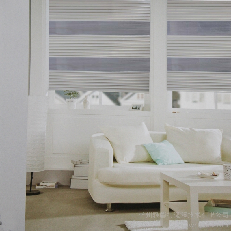 雙層透光簾布設計--中間透光簾片寬2`1/2,具有百葉簾開啟,調光功能。--調節(jié)簾布角度,可使不同透光度簾布重疊,擁有布藝輕柔的質感。有效阻擋紫外線--隔光簾布閉合時可隔離98%紫外線,保護室內物品免受紫外線損--隔光簾布開啟時可隔熱63%紫外線。簾布表面經高溫,高壓,防靜電處理--簾布不易積灰,清潔保養(yǎng)簡單,方便--面料不易變形。有內藏式頂槽-窗簾完全收攏時,簾布與底槽完全隱藏于頂槽內,可有效保護窗簾。雙層可局布調節(jié)光線的柔紗簾,集百葉簾與卷簾功能一體,立體感強,非常溫馨,適合家居,酒店,別墅**寫字樓等辦公場所。