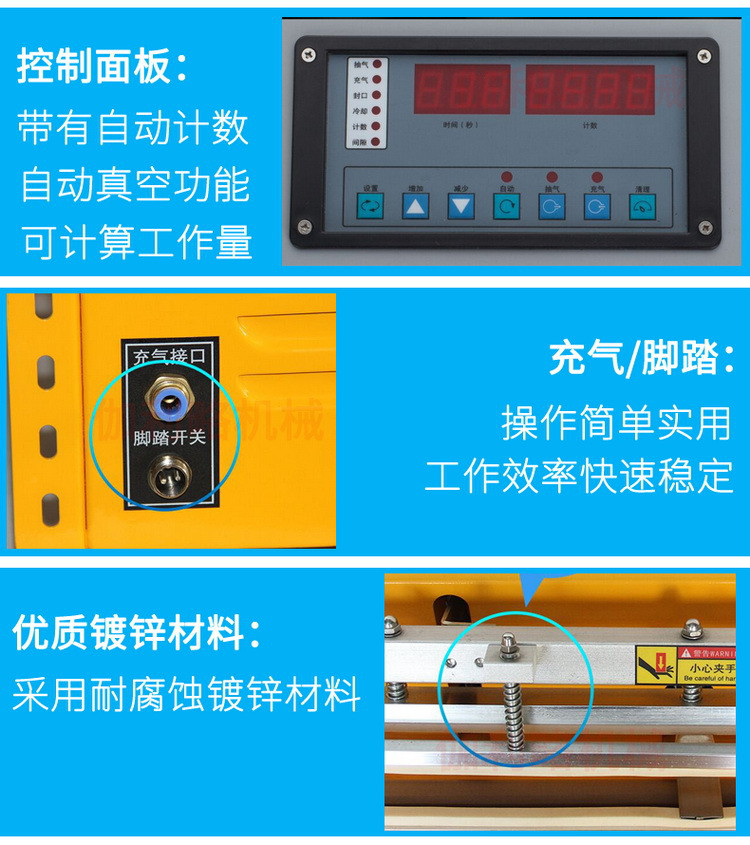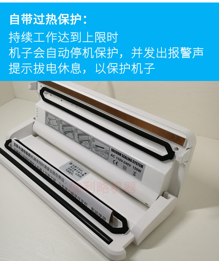 。7、當(dāng)主電路溫度過高時(shí),過熱保護(hù)裝置工作時(shí),機(jī)器自動(dòng)停機(jī)。當(dāng)溫度降至正常時(shí),設(shè)備會(huì)自動(dòng)開始自動(dòng)密封。