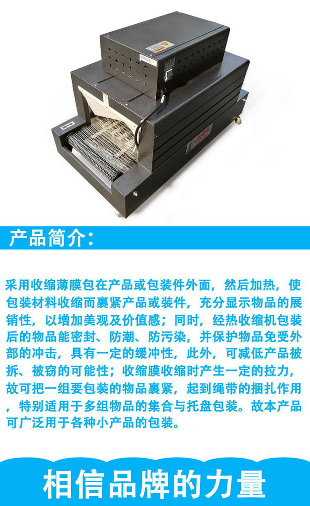 收縮包裝是目前國際市場上較先進的包裝方法之一。它是采用收縮薄膜包在產(chǎn)品或包裝件外面,然后加熱,使包裝材料收縮而裹緊產(chǎn)品或裝件,充分顯示物品的展銷性,以增加美觀及價值感;同時,經(jīng)熱收縮機包裝后的物品能密封、防潮、防污染,并保護物品免受外部的沖擊,具有一定的緩沖性,此外,可減低產(chǎn)品被拆、被竊的可能性;收縮膜收縮時產(chǎn)生一定的拉力,故可把一組要包裝的物品裹緊,起到繩帶的捆扎作用,特別適用于多組物品的集合與托盤包裝,故本產(chǎn)品可廣泛用于各種小產(chǎn)品的包裝。廣泛應用于食品、飲料、醫(yī)藥、日化、五金、木制品、文化用品、印刷制品、塑料制品、玻璃制品、電子元件等產(chǎn)品的單一、集合或組合包裝。