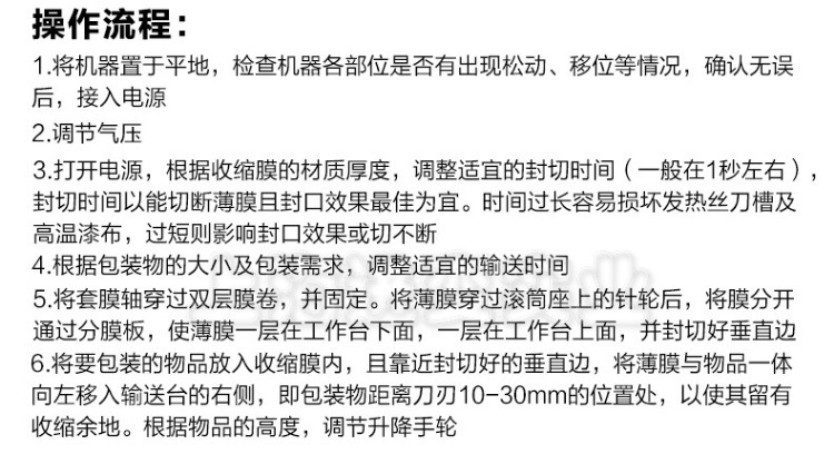 10包裝結(jié)束后,應先關閉加熱開關,并讓輸送電機與熱風電機繼續(xù)運行15分鐘,然后再切斷整個電源,這樣可延長加熱管等部件的使用壽命。