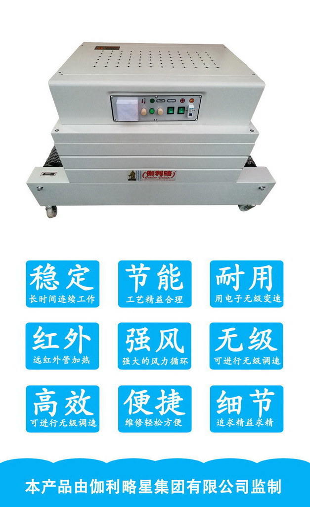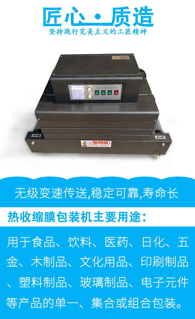 收縮包裝是目前國際市場上較先進的包裝方法之一。它是采用收縮薄膜包在產品或包裝件外面,然后加熱,使包裝材料收縮而裹緊產品或裝件,充分顯示物品的展銷性,以增加美觀及價值感;同時,經熱收縮機包裝后的物品能密封、防潮、防污染,并保護物品免受外部的沖擊,具有一定的緩沖性,此外,可減低產品被拆、被竊的可能性;收縮膜收縮時產生一定的拉力,故可把一組要包裝的物品裹緊,起到繩帶的捆扎作用,特別適用于多組物品的集合與托盤包裝,故本產品可廣泛用于各種小產品的包裝。廣泛應用于食品、飲料、醫藥、日化、五金、木制品、文化用品、印刷制品、塑料制品、玻璃制品、電子元件等產品的單一、集合或組合包裝。