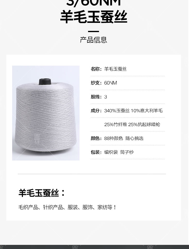 【志源】廠價供應柔順輕滑做工精細3/60NM羊毛玉蠶絲大朗玉蠶絲