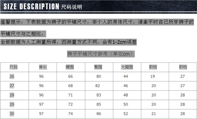 | 褲長(zhǎng):長(zhǎng)褲 | 尺碼:26,27,28,29,30 |