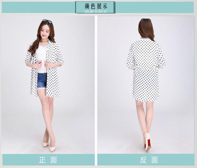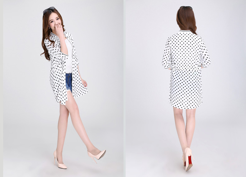 2015夏裝新款韓版雪紡開衫女中長款式黑白圓點系帶短袖大碼空調衫