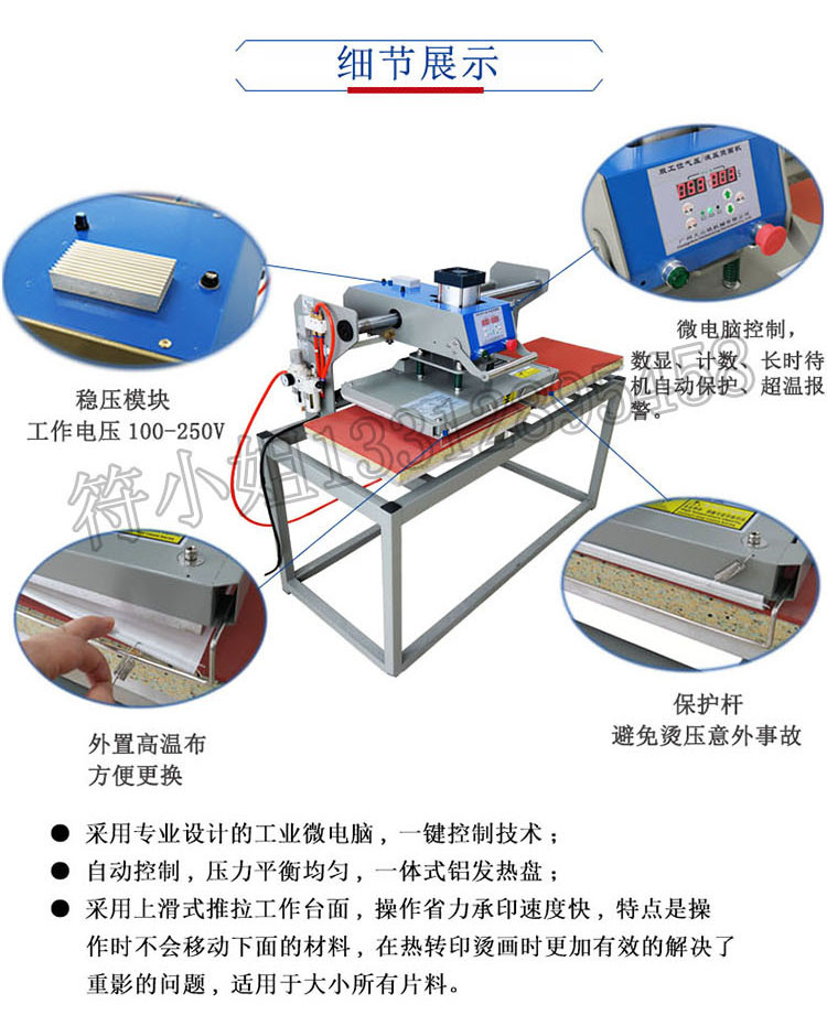 ● 采用上滑式推拉工作臺面,操作省力承印速度快,操作時不會移動下面的材料。特別在熱轉(zhuǎn)印燙畫時有效的解決了重影的問題,適用于大小所有片料。
