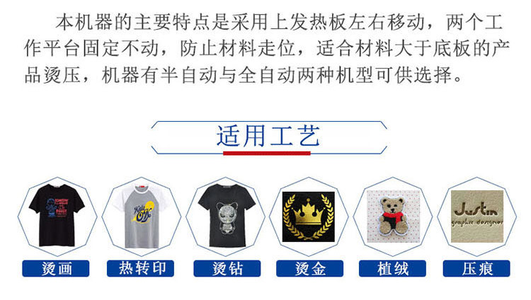 適合熱轉(zhuǎn)印、熱升華、燙鉆、燙金、壓痕、植絨、發(fā)泡處理等工藝,適合生產(chǎn)訂單大的客戶。