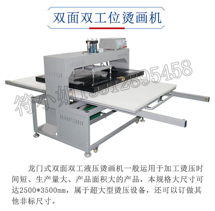 龍門式雙面雙工液壓燙畫機一般運用于加工燙壓時間短、生產量大、產品面積大的產品,本機器可做大尺寸規格至2500*3500mm,屬于超大型燙壓設備,還可以訂做其他非標尺寸。
