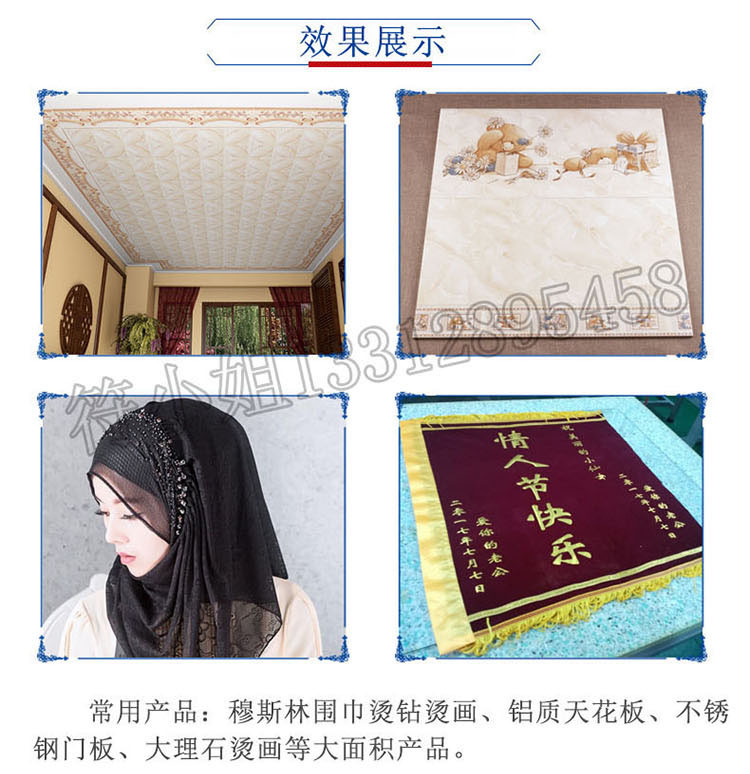 常用產品:圍巾燙鉆燙畫、鋁質天花板、不銹鋼門板、大理石燙畫等大面積產品。