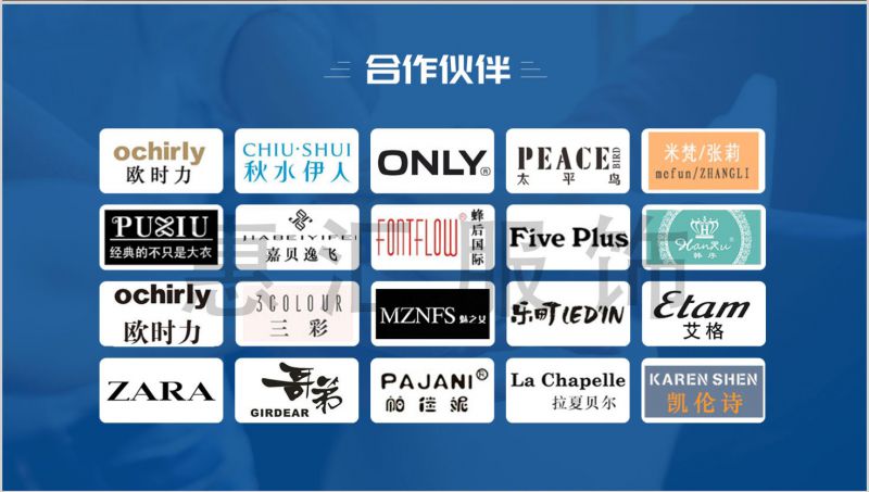 公司長(zhǎng)期合作品牌有:歐時(shí)力、納紋、太平鳥、風(fēng)笛、哥弟、秋水伊人、衣香麗影、埃文、歐州站、江南布衣、Only、艾格、歌莉婭、蟲蟲、紅袖、VERO MODA、喬帛、芭依璐、一日了然、貝洛安、洛貝一、雙面羊絨大衣、真絲連衣裙、旗袍、拉夏貝爾、阿依蓮、百家好、韓序、例外初語(yǔ)棉麻、一席之地棉麻、塵色棉麻、卓拉、維多利亞、維伊、味之道棉麻、等等....公司服裝款式眾多,風(fēng)格多元化(有歐版女裝,韓版女裝,風(fēng)衣,連衣裙,淑女裝等),做工精良,貨源穩(wěn)定,和眾多品牌廠商保持良好的合作關(guān)系。公司秉承“關(guān)注客戶、攜手共贏”的服務(wù)理念; 熱忱歡迎各界朋友前來(lái)合作,共創(chuàng)輝煌!歡迎來(lái)司考察看貨