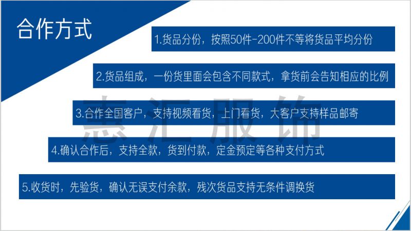 公司長期合作品牌有:歐時力、納紋、太平鳥、風笛、哥弟、秋水伊人、衣香麗影、埃文、歐州站、江南布衣、Only、艾格、歌莉婭、蟲蟲、紅袖、VERO MODA、喬帛、芭依璐、一日了然、貝洛安、洛貝一、雙面羊絨大衣、真絲連衣裙、旗袍、拉夏貝爾、阿依蓮、百家好、韓序、例外初語棉麻、一席之地棉麻、塵色棉麻、卓拉、維多利亞、維伊、味之道棉麻、等等....公司服裝款式眾多,風格多元化(有歐版女裝,韓版女裝,風衣,連衣裙,淑女裝等),做工精良,貨源穩定,和眾多品牌廠商保持良好的合作關系。公司秉承“關注客戶、攜手共贏”的服務理念; 熱忱歡迎各界朋友前來合作,共創輝煌!歡迎來司考察看貨