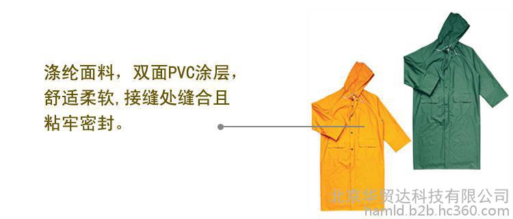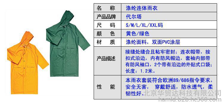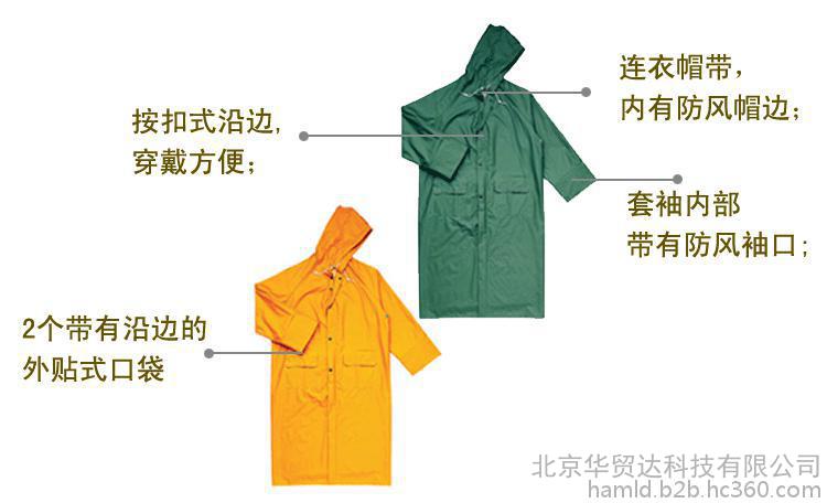 產品說明 :雨衣,接縫處縫合且粘牢密封。連衣帽帶帽帶,按扣式沿邊,內有防風帽邊,套袖內部帶有防風袖口,2個帶有沿邊的外貼式口袋,長度:1.20米。厚度:0.32mm。
