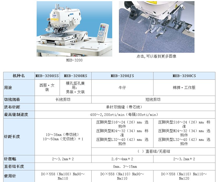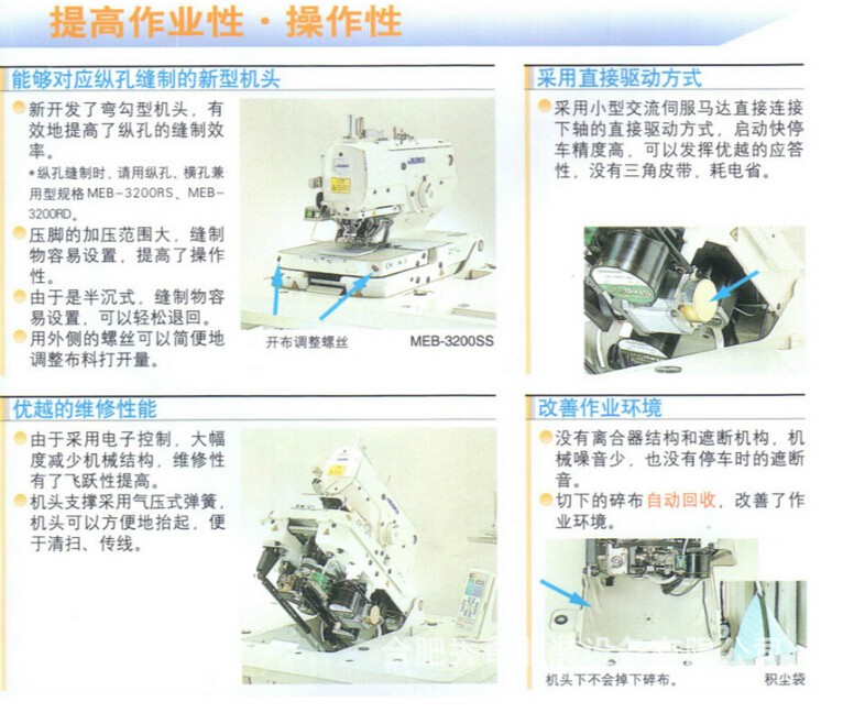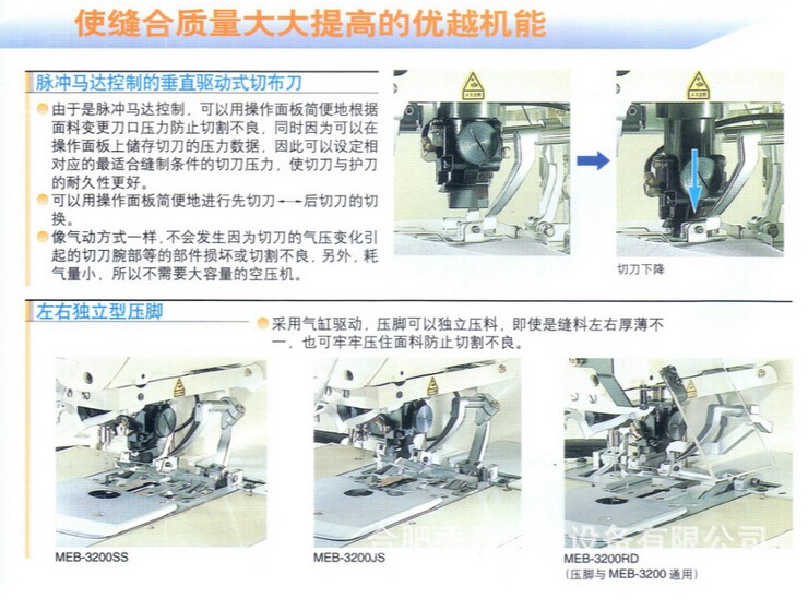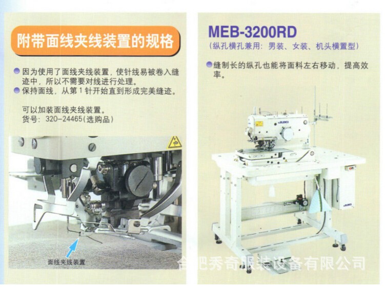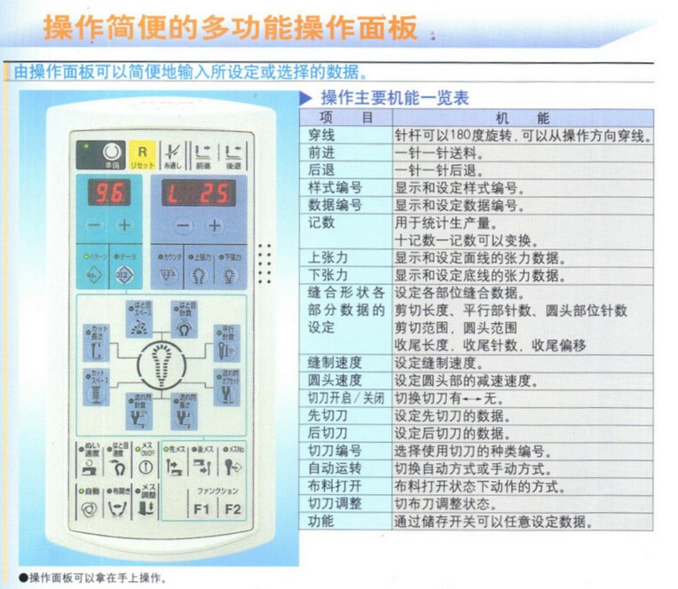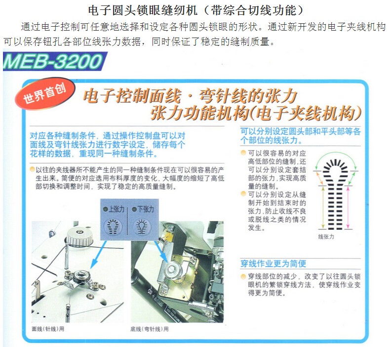 通過電子控制可任意選擇和設定各種圓頭鎖眼的形狀。通過新開發的電子夾線器裝置可以保存鈕孔個部位線張力數據,同時保證了穩定的縫制質量。