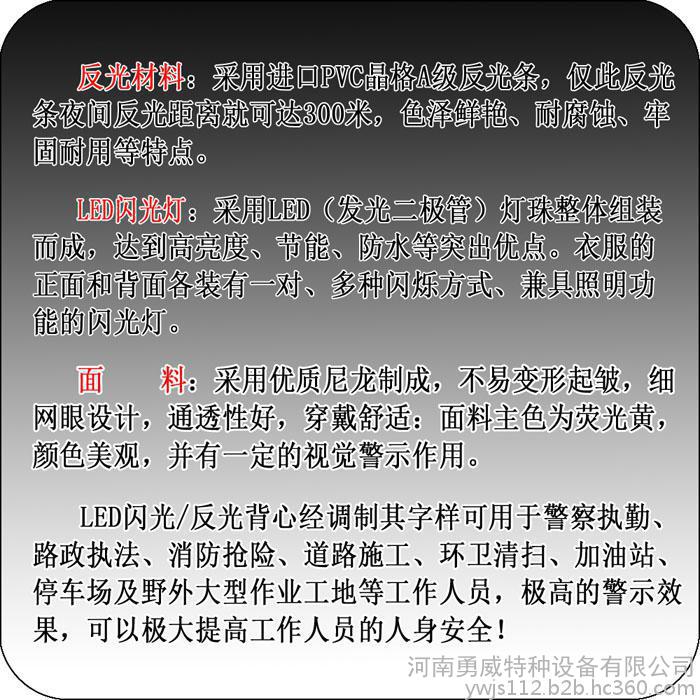 首要樣式有:差人反光背心**反光背心,路政反光背心,城管反光背心,2015新款反光背心,交通反光背心,安全反光背心;15款反光背心,熒光黃反光背心,網眼布反光背心,防凍抗裂反光背心,冬季反光背心,反光背心反光背心主體由網眼布或平紋布制成,反光資料是反光晶格或高亮度反光布;
