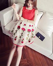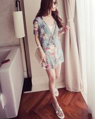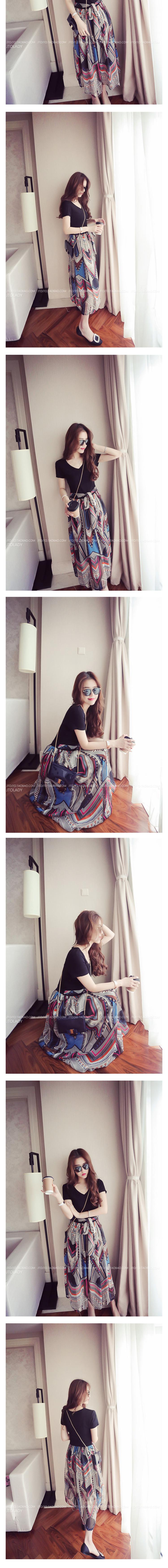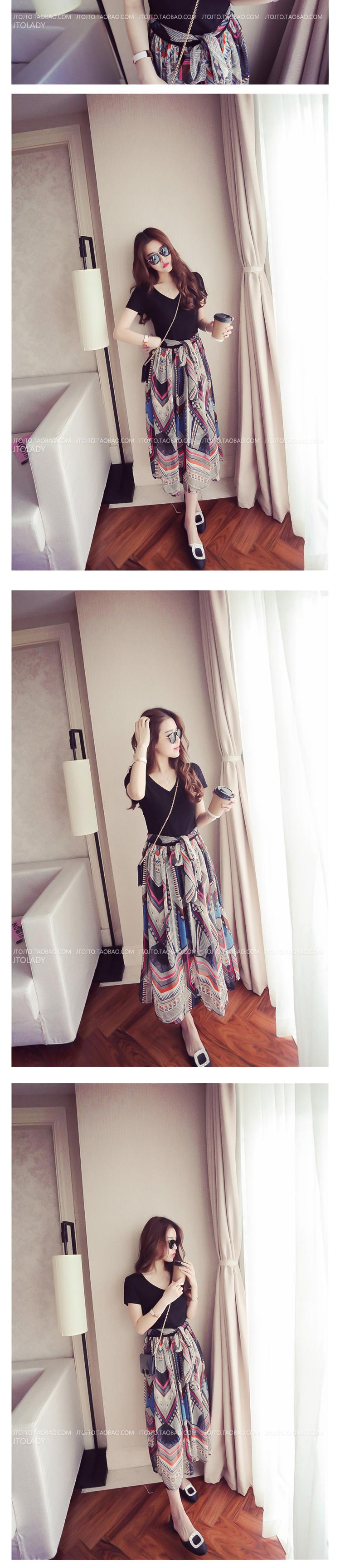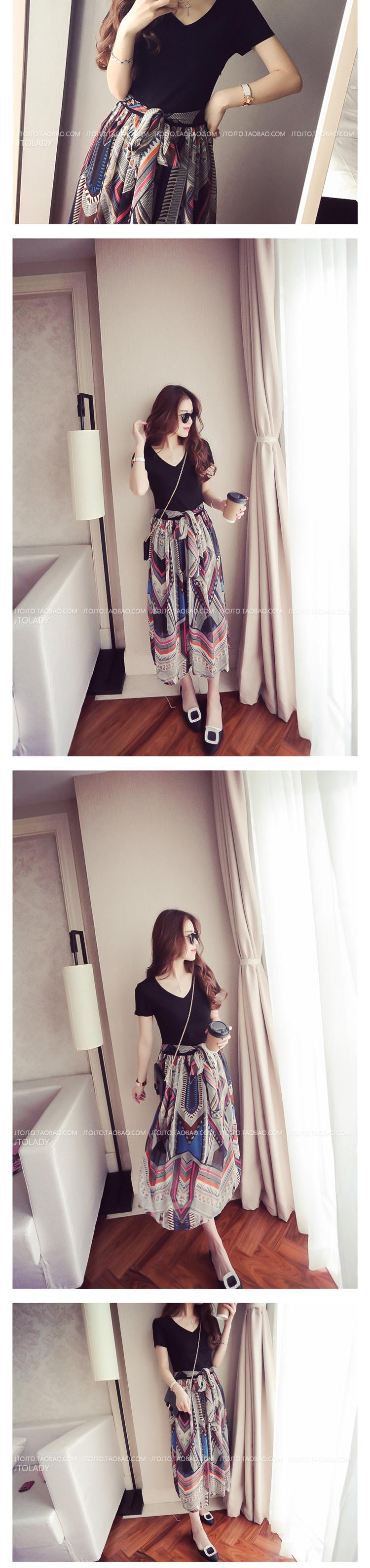 ■Brand/品名:歐美撞色V領拼下擺印花系腰帶修身連衣裙女 |
