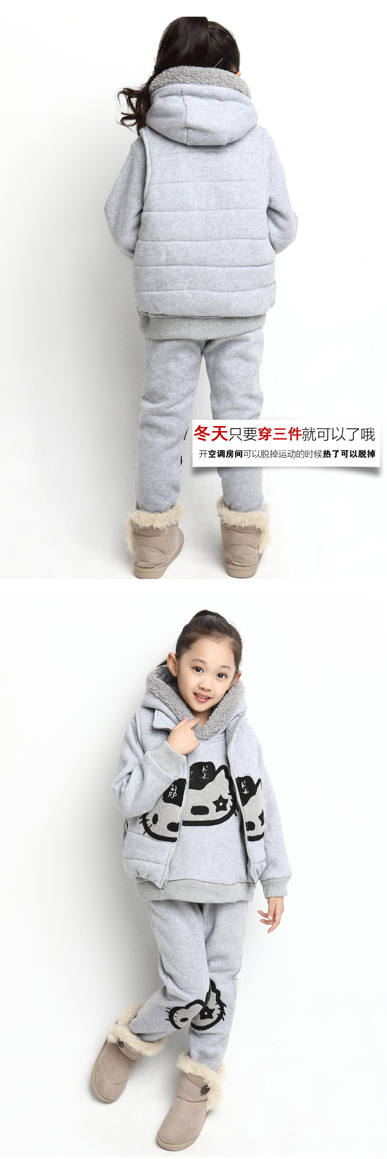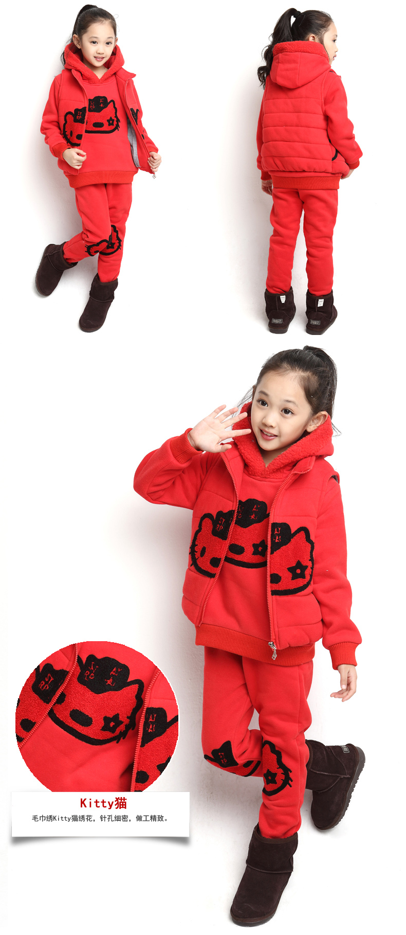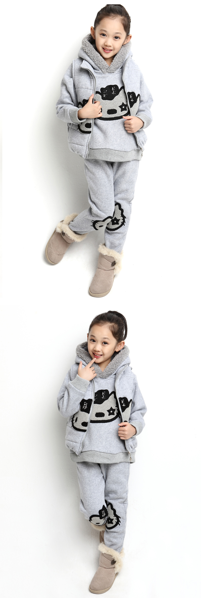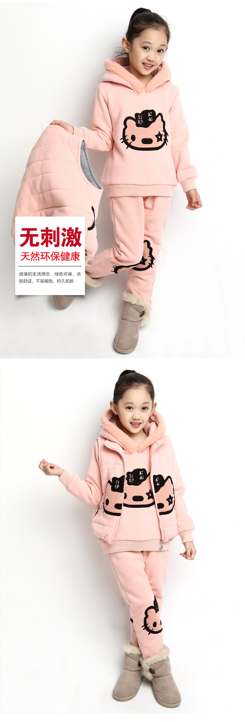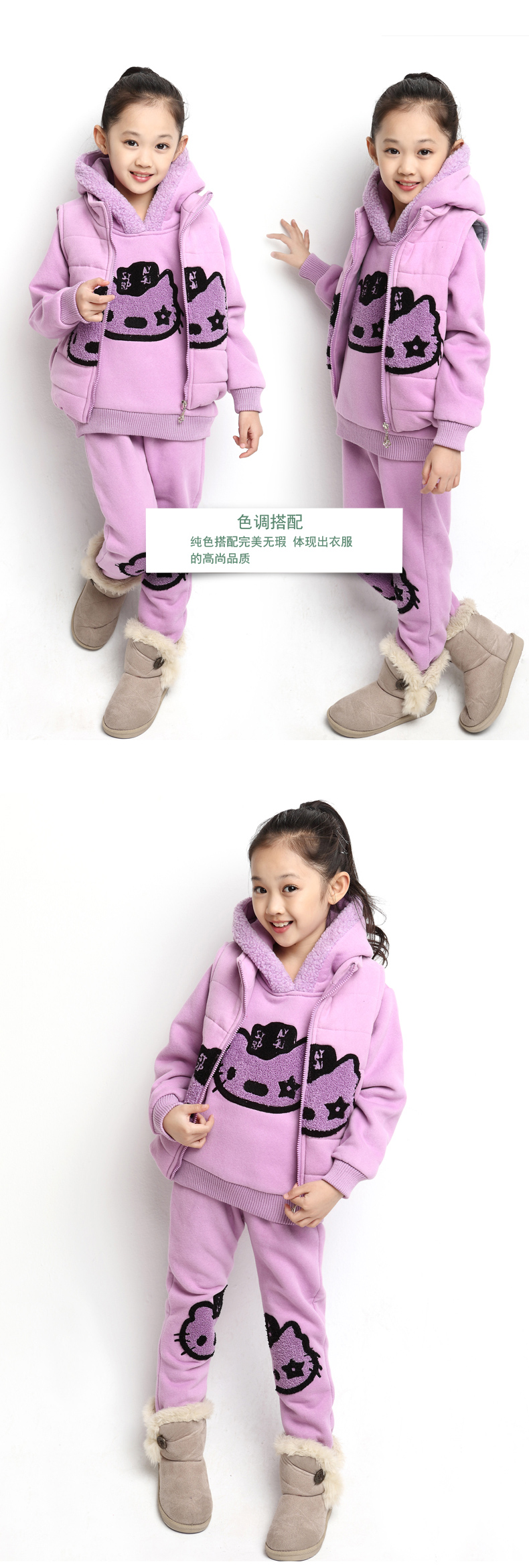 包郵童裝時(shí)尚體驗(yàn)中大童冬款加厚衛(wèi)衣女童套裝加絨純色KT貓三件