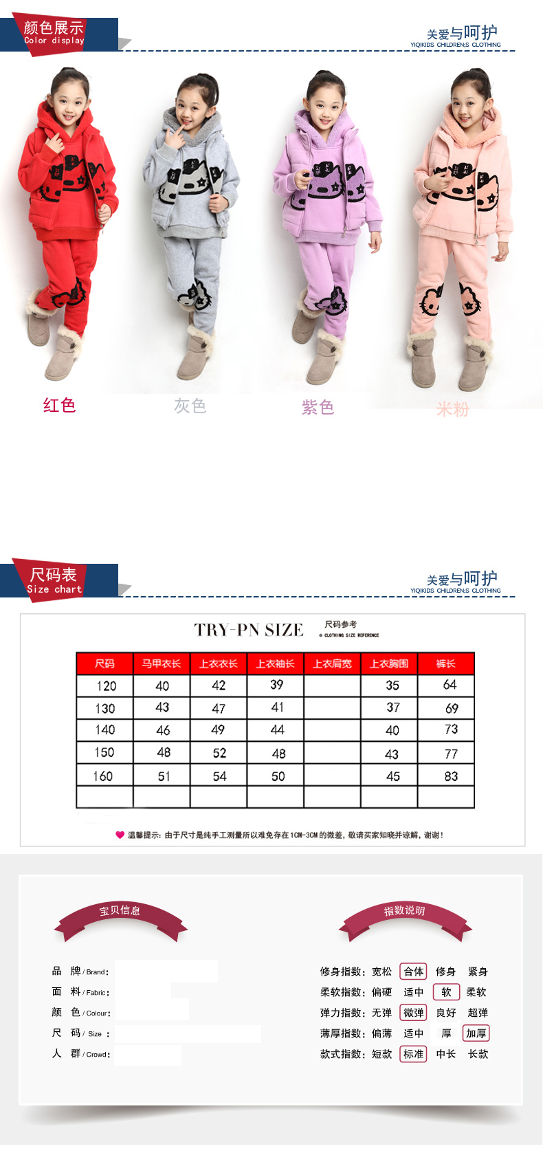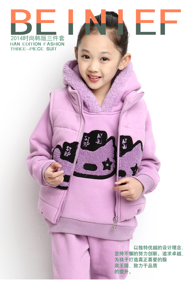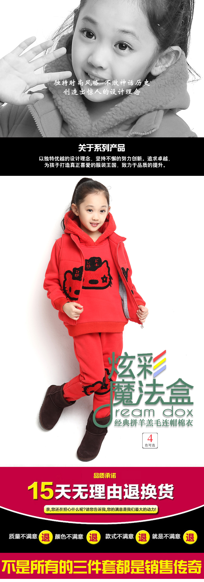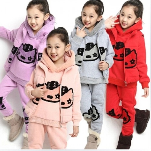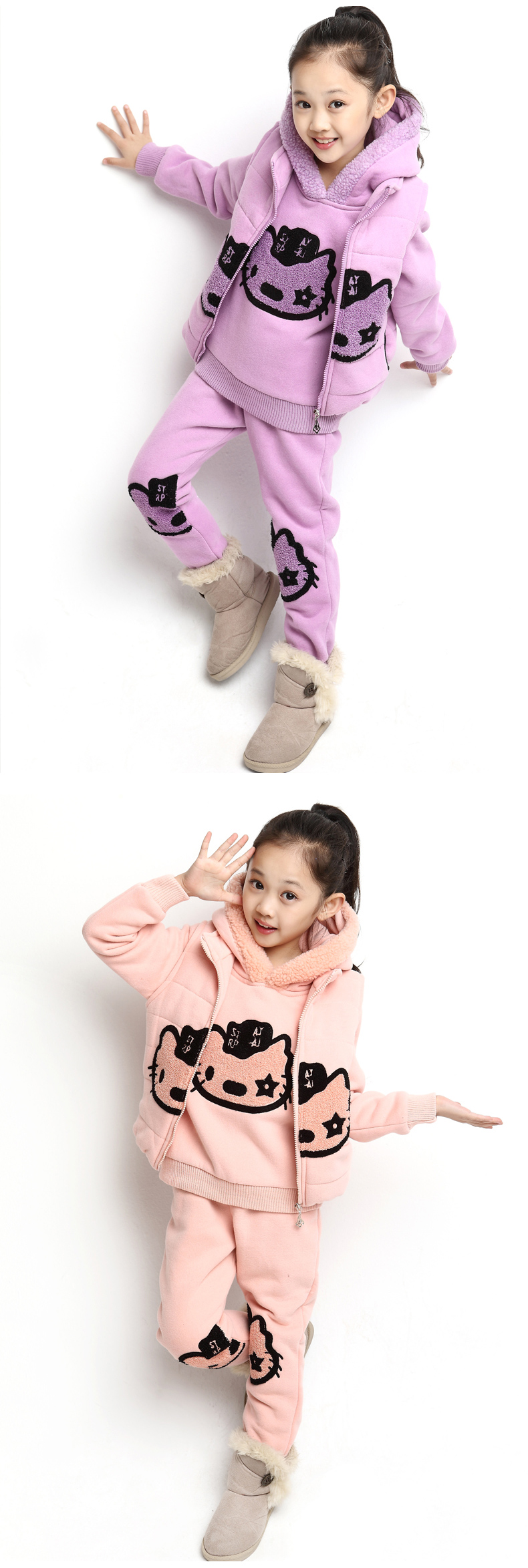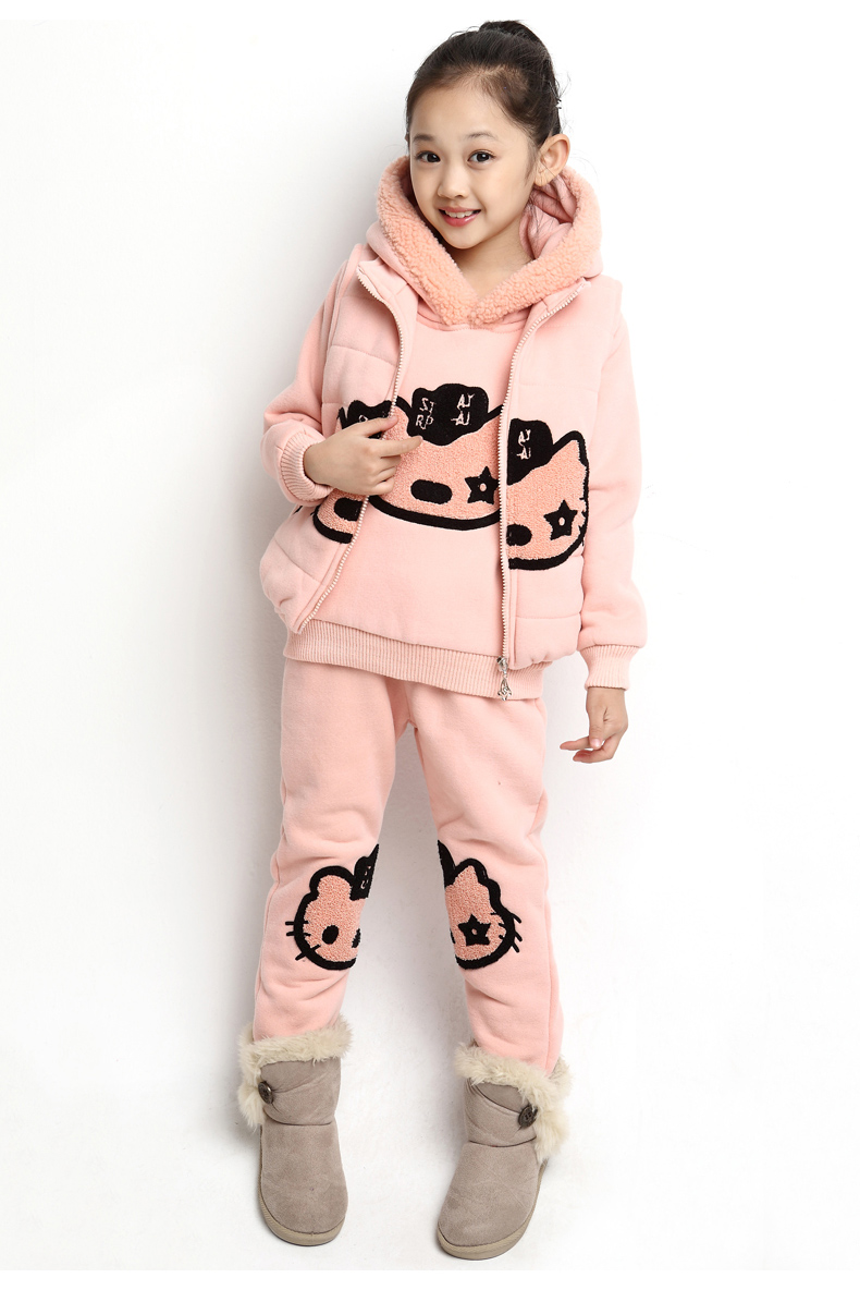 包郵童裝時(shí)尚體驗(yàn)中大童冬款加厚衛(wèi)衣女童套裝加絨純色KT貓三件