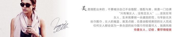 女人的萬種風(fēng)情離不開絲巾。女人愛絲巾**如同愛香水般自然。 如果只能選一樣飾物使女人更有韻味的話,一定首推絲巾。 絲巾是女人美麗的語言,在色彩斑斕中訴說情懷。每條絲巾、每種打法都表達(dá)著女人不同的心態(tài)和情緒。 善用絲巾的女人無疑是一道美麗的風(fēng)景。 絲巾風(fēng)情,絲絲關(guān)情。有了絲巾的陪襯,女人更加清新淡雅,日久彌香! |