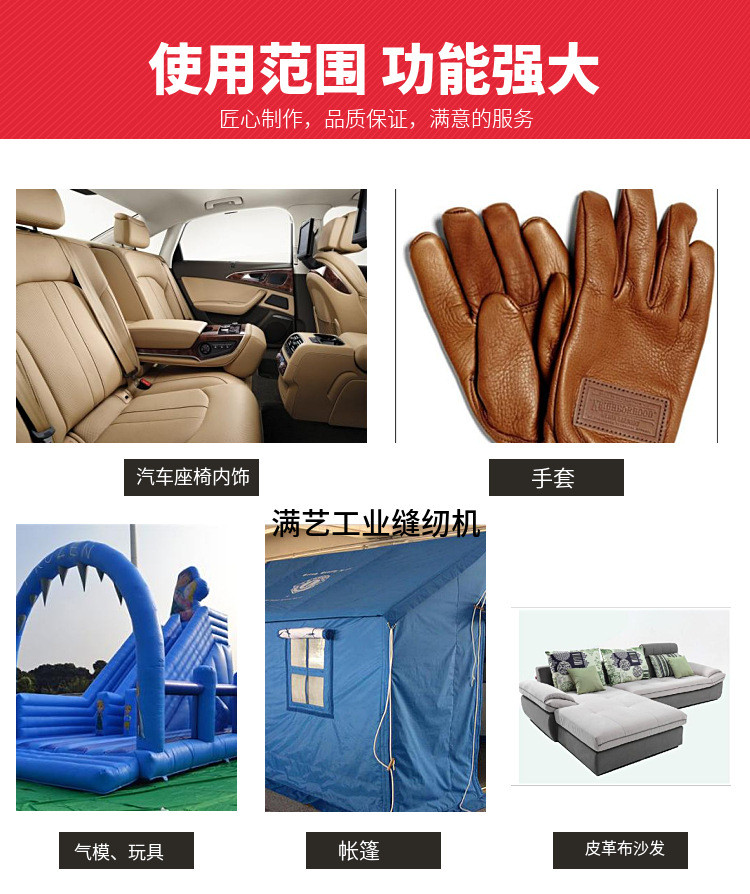 適合于:高端汽車坐墊、安全帶、安全氣囊等汽車飾件的縫制,還可適用于帳篷、降落傘、皮革沙發、汽車座套、體育用品、等大型器具的縫制.