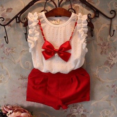 新款2015童裝 夏款女童 褶皺花邊背心+短褲2件套送項鏈
