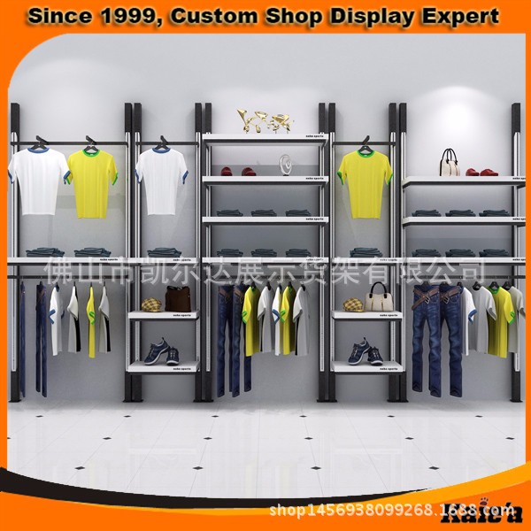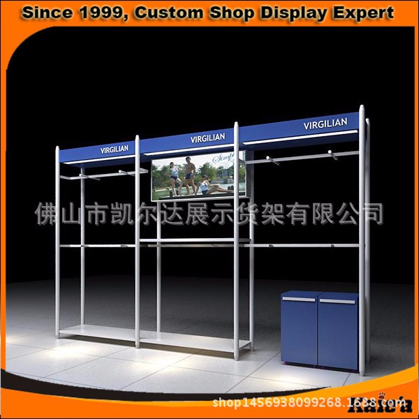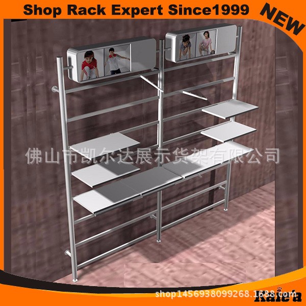 產品名稱:專業生產童裝店可調節展架女裝店展柜童裝展示柜皮包鐵木展架高柜(價格面議)