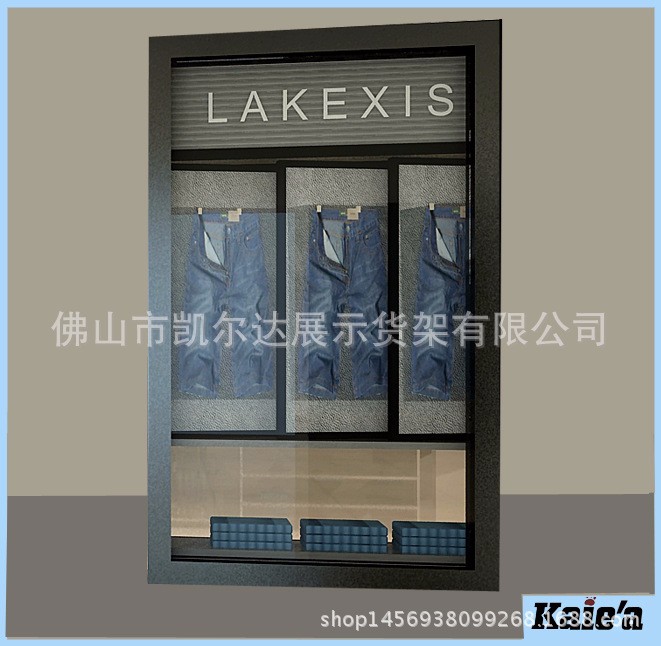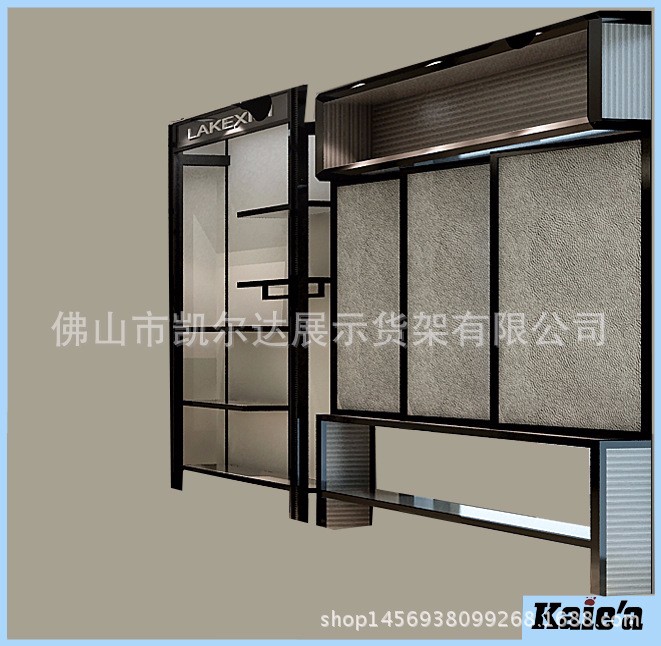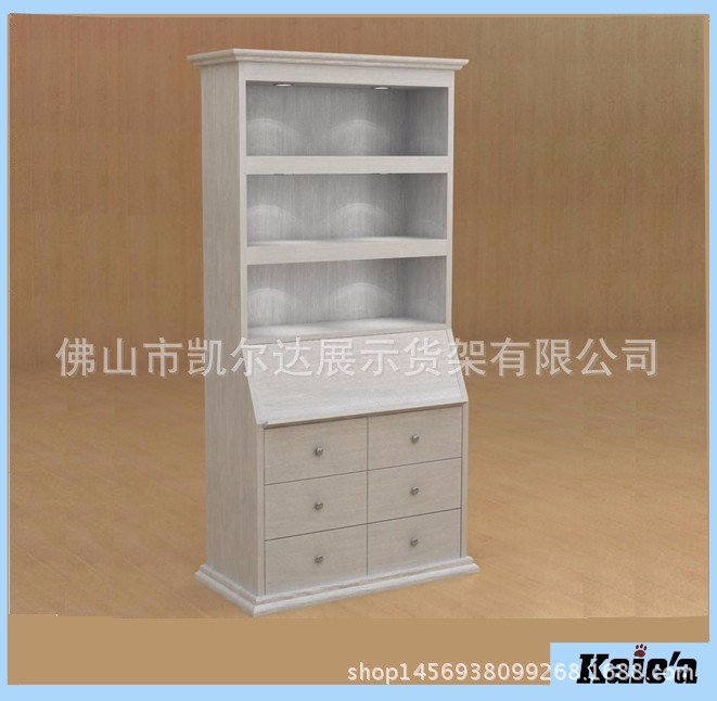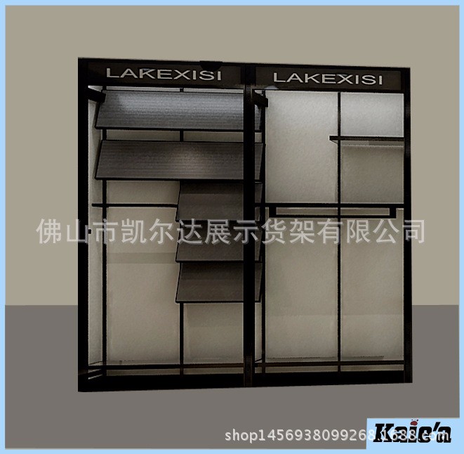產品名稱:凱爾達牛仔展示高柜 實木烤漆展架 鐵木結合 歐式簡約鞋中島(價格面議)