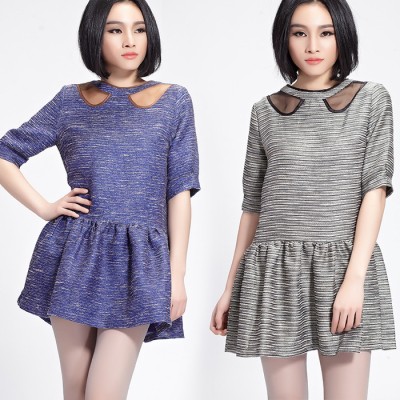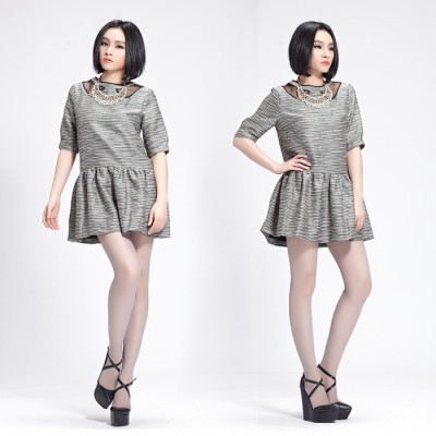 供應2014新品 連衣裙秋季 甜美五分袖織錦腰部褶皺拼紗短裙女裙子